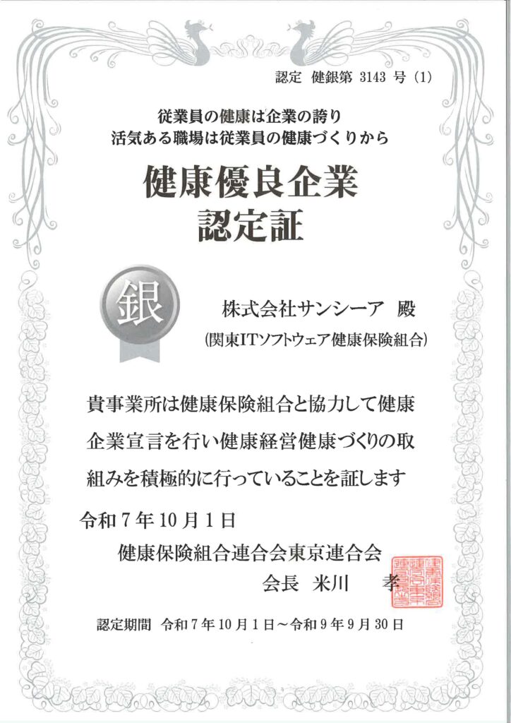 このたび、健康保険組合連合会東京連合会より、引き続き「健康企業宣言 銀の認定」を取得いたしました。